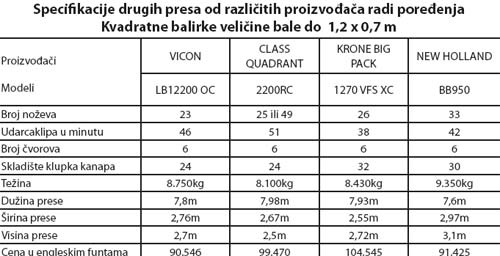 Snabdevena sa impresivnim integrisanim pužastim rotorom i sistemom koji omogućava ravnomernu zapreminu bala (Power Density feeder system), Vicon LB12200 dobija visoku ocenu među presama, po velikom dnevnom učinku, dobroj uniformnosti odnosno zapremini bala i dobrom vezivanju. Uprkos tako dobrim karakteristikama ova presa ima i neke mane kao što su teška promena veličine bala, manipulacija oko zamene igala i opasnost od njihovog okidanja u toku provlačenja kanapa kao i velika osetljivost grabulja i pužastog rotora u toku vožnje. Kada je reč o ceni ona je uslovljena visokom specijalizovanošću ove mahanizacije. Zajedno sa pratećom opremom i gumama ova balirka vredi oko 90.540 engleskih funti.