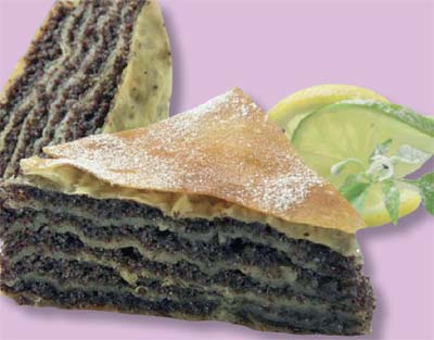 Napraviti fi l mešajući sve sastojke osim maka. U nauljen pleh ređati koru po koru. Svaku koru prskati filom i posuti makom.Iseći na kocke i ispeći na 180 stepeni C.