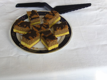 Izmrviti brašno sa puterom i dodati 2 žumanca, 70 grama šećera i pola kesice praška za pecivo i umesiti u jednolično testo. Razvaljati testo na brašnom posutoj podlozi, a zatim ga pomoću oklagije preneti u veliki pleh. Staviti u rernu 10 minuta na 180°C da se tek napola zapeče. Umutiti čvrst sneg od četiri belanca, sipati lagano 150 grama šećera i na kraju rukom umešati orahe.