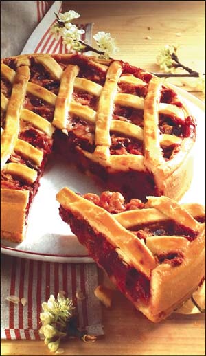 Od brašna, 75 gr šećera, soli, jaja i maslaca umesite testo i ostavite na hladnom mestu, zamotano u foliju otprilike 1 sat. Šljive operite, očistite i naseckajte. Umutite dva žumanca sa preostalim šećerom, limunovom koricom i cimetom. Šljive dobro ocedite i pomešajte sa kremom od jaja. Rernu zagrejte na 200 stepeni. Razvijte testo, stavite ga u kalup i oblikujte rub kao na slici. Pospite pržene lešnike po testu a zatim stavite nadev u sredinu. Preklopite trakama od testa koje ste prethodno odvojili. Pomešajte mleko i preostalo žumance i time premažite trake od testa. Kolač pecite 30-40 minuta dok ne dobije zlatno-žutu boju.