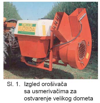 (difuzora) utiče na smer vazdušne struje, oblik lepeze i raspored vazdušne struje a samim tim i raspored tečnosti. Na slikama 1 i 2 prikazan je orošivač sa velikim dometom, namenjen za tretiranje voćaka sa jako razvijenom krošnjom, kao i šumskih stabala, drvoreda i gradskog zelenila.