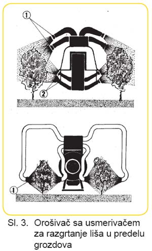 Na slici 3 prikazan je orošivač sa usmerivačem pogodnim za stvaranje efekta razgrtanja lišća samo u predelu zone grozdova. Zbog pojave poznatog parazita Botrytis cinarea (siva plesan) javila se potreba primene takvog usmerivača vazdušne struje koja će omogućiti: