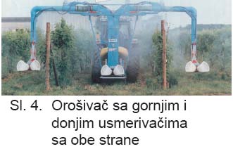 Postoje i takva rešenja koje je prva razvila francuska fi rma Tecnoma (Teknom), gde je aksijalni ventilator veoma uzdignut i smešten u obrtnu glavu. To omogućuje podešavanje u horizontalnoj ravni (α < 240°) i istovremeno tretiranje i do 12 redova vinove loze (slika 100). Učinak je veoma veliki – 30-60 ha/dan ali je biološka zaštita veoma loša. Naime, donji delovi čokota odnosno naličja listova ostaju nezaštićeni. Ovi orošivači se koriste i za zaštitu ratarskih kultura