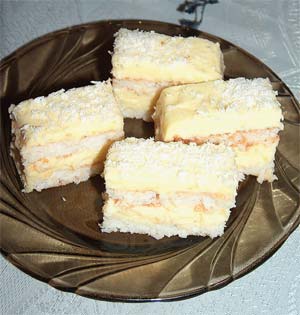 Kremu pripremiti na sledeći način: od 600 mililitara mleka oduzeti 200 mililitara i u to razmutiti puding od vanile, šećer, brašno i žumanca. Ostatak mleka staviti da prokuva i u njega sipati razmućenu smesu. Kuvati dok se krema ne zgusne. Skloniti sa vatre i ohladiti. Razmutiti margarin i šećer u prahu. U to dodati kuvanu kremu i dobro umutiti. Filovati: kora-krema-kora-krema. Odozgo posuti kokosom.