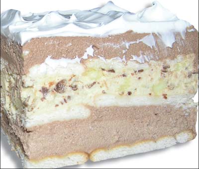 Od ukupne količine mleka odvojiti 1 dcl i razmutiti puding. Ostatak mleka ostaviti da proključa, dodati 10 kašika šećera i razmućeni puding. Kuvajte dok masa ne počne da se steže. Ostaviti da se ohladi uz povremeno mešanje. Razmutite 2 margarina sa 5 kašika prah šećera. U ovu smesu dodavajte ohlađeni puding kašiku po kašiku. Masu podelite na tri dela. Krem bananice sitno iseckajte, 150 g čokolade otopite. U prvi deo smese dodajte150 gr eurokrema, u drugi dodajte iseckane bananice, i u treći istopljenu čokoladu. Na tacnu poređajte keks. Poprskajte ga sokom od pomorandže, nanesite prvi fil, pa opet red keksa, pa drugi fil, red keksa, treći fil i odozgo šlag.