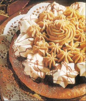 Odmrznuti lisnato testo i razvaljati ga u dva kruga prečnika oko 22 cm. Peći 10-15 minuta u rerni zagrejanoj na 200°C. Za čokoladnu kremu mešati na pari pavlaku, čokoladu, kakao i šećer da se sve otopi i sjedini, ohla|eno staviti u frižider da se stegne. Za kremu od kestena dodati pireu rum i 50 grama šećera u prahu. Slatku pavlaku umutiti sa vanilin šećerom pa 2/3 sjediniti lagano sa kesten pireom. Ohlađenu čokoladnu kremu mutiti mikserom da se dobije pena. Polovinom kreme spojiti kore, a polovinu namazati na gornju koru. Kremu od kestena staviti odozgo špricom u obliku ručica, a uz rub poslagati puslice. Preostali šećer zagrevati da se karamelizira i njim ukrasiti puslice.