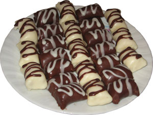 Umesite sve sastojke u jednoličnu masu i pravite valjčiće. Secite valjčiće na dužinu bombona, a zatim ih umočite u rastopljenu belu ili crnu čokoladu i stavljajte na rešetku da se ocede. Praline možete dodatno išarati čokoladom suprotne boje.