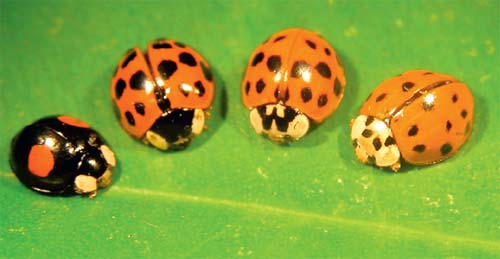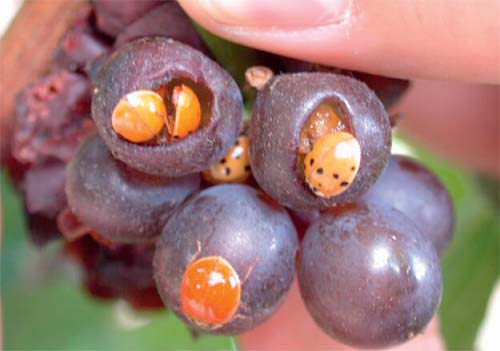 Vrsta Harmonia axyridis se nalazi na spiskovima najnepoželjnijih organizama Evrope i Severne Amerike. Zbog svoje velike efi kasnosti u suzbijanju lisnih vaši je preneta iz Azije u Severnu Ameriku i Evropu. Međutim, posle kratkog vremena je pokazala svoje drugo lice. Ova vrsta toliko efikasno suzbija lisne vaši, da druge bubamare ostaju bez hrane. Harmonia ima veoma promenljive crne pege na crvenim krilima, a ono što je karakteristično je crnaW ili M šara na beloj glavi. Dodatni problem je što se ponekad hrani i larvama drugih bubamara koje su na nekoj teritoriji odomaćene. Takođe, krajem leta i tokom jeseni ona se ponekad hrani i zrelim voćem i grožđem. Ako ove bubamare uđu u preradu vina, zbog alkaloida koje imaju u sebi, vino gubi kvalitet. Kao jedno od pogodnih mesta za skupljanje radi prezimljavanja se navode upravo grozdovi grožđa. Takve grozdove obavezno treba odvojiti i ne stavljati ih u preradu jer je moguće da je harmonia, dok ste je stresali sa grozda, već ispustila kokocinelin koji će se svakako odraziti na ukus vašeg vina.