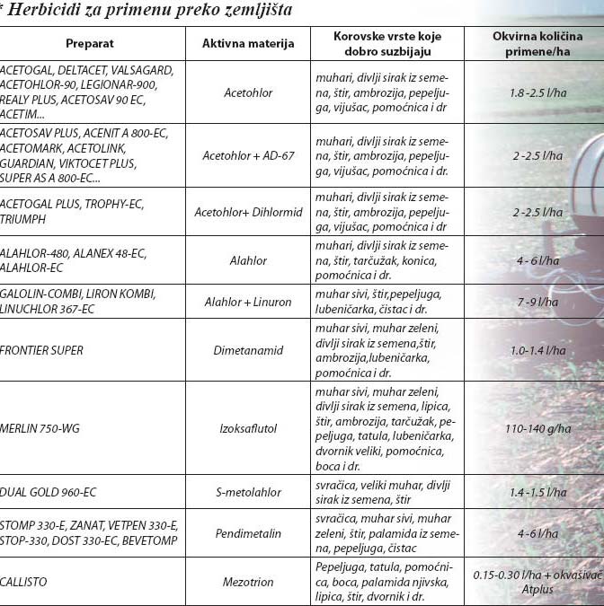 prilagodljivih korovskih biljaka, akcenat na zaštitu kukuruza od korova stavljen je upravo na ovaj predstojeći period, dakle, posle setve a pre nicanja kukuruza (tzv. preemergence primena, pre-em tretmani). Na tržištu se nalazi veliki broj preparata (čak preko 40 različitih) na bazi aktivnih materija koje se mogu koristiti u ove svrhe, od kojih su neki prikazani u tabeli.