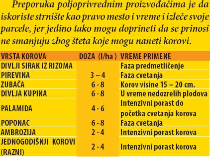 Uništavanje korova vrši se herbicidima. Brojni herbicidi za ovu namenu su na raspolaganju našim poljoprivrednim proizvođačima. Iz grupe translokacijskih neselektivnih herbicida nabrojaćemo samo neke: Glifol, Dominator i dr. svi sa aktivnom materijom glifosat. Translokacijski herbicidi su herbicidi koji se upijaju u biljku putem njenih zelenih biljnih delova i translociraju po biljci (putuju u ostale biljne delove uključujući i koren). Budući da samo usvajanje i translokacija traju 24-48 sati, to i vizuelne efekte primene možemo očekivati tek za 3 -10 dana nakon prskanja, zavisno od vrste korova, kad korov počne da žuti i vene.
